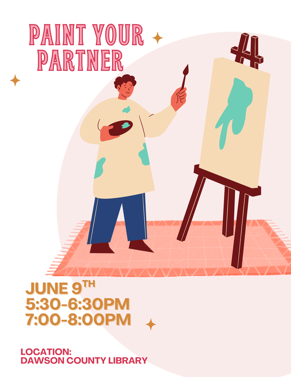 Looking for a fun night out? Come and join us at The Dawson County Library for a fun painting activity called Paint Your Partner! We will be having two sessions, one at 5:30-6:30PM and the other at 7:00-8:00PM.